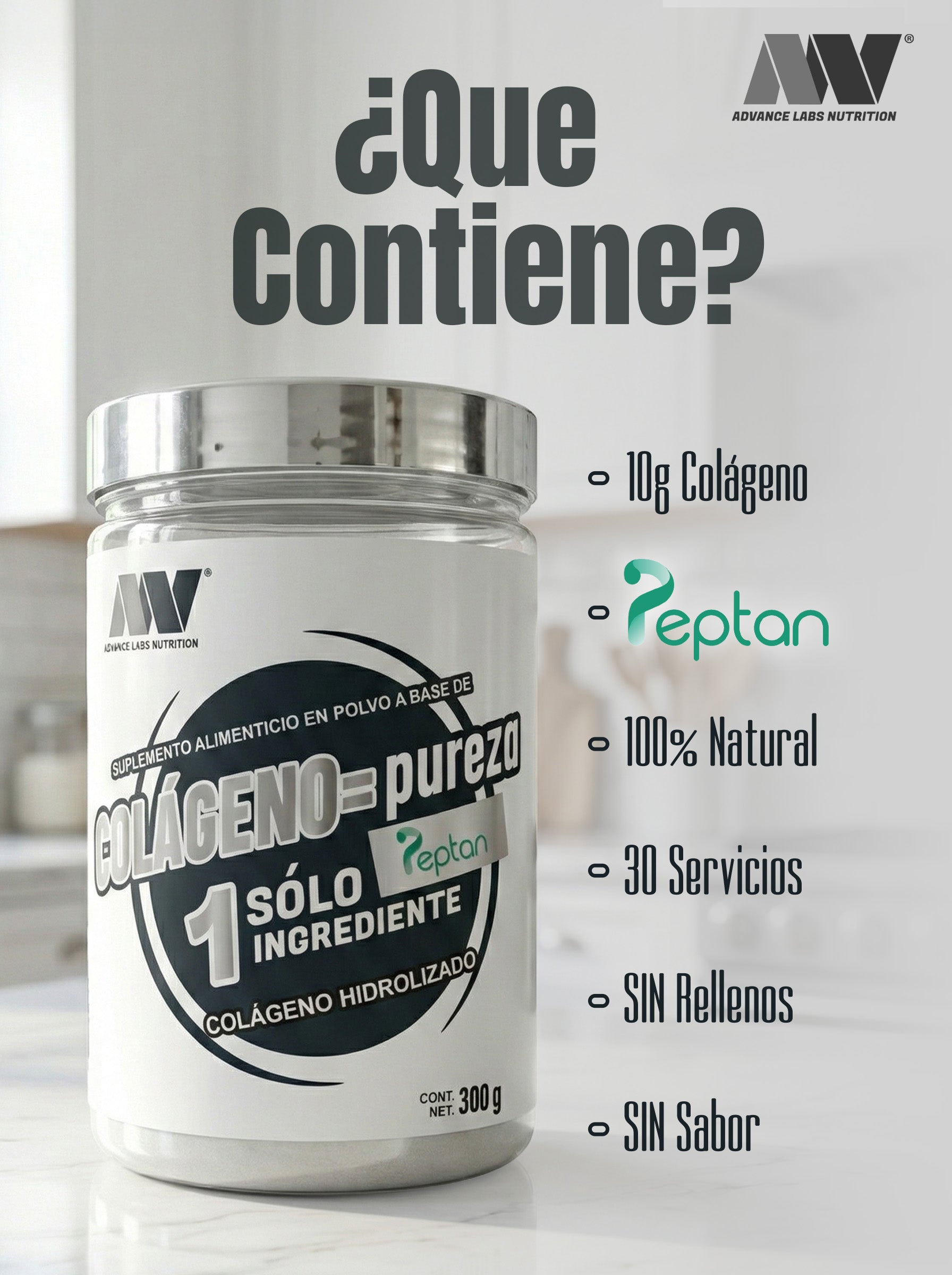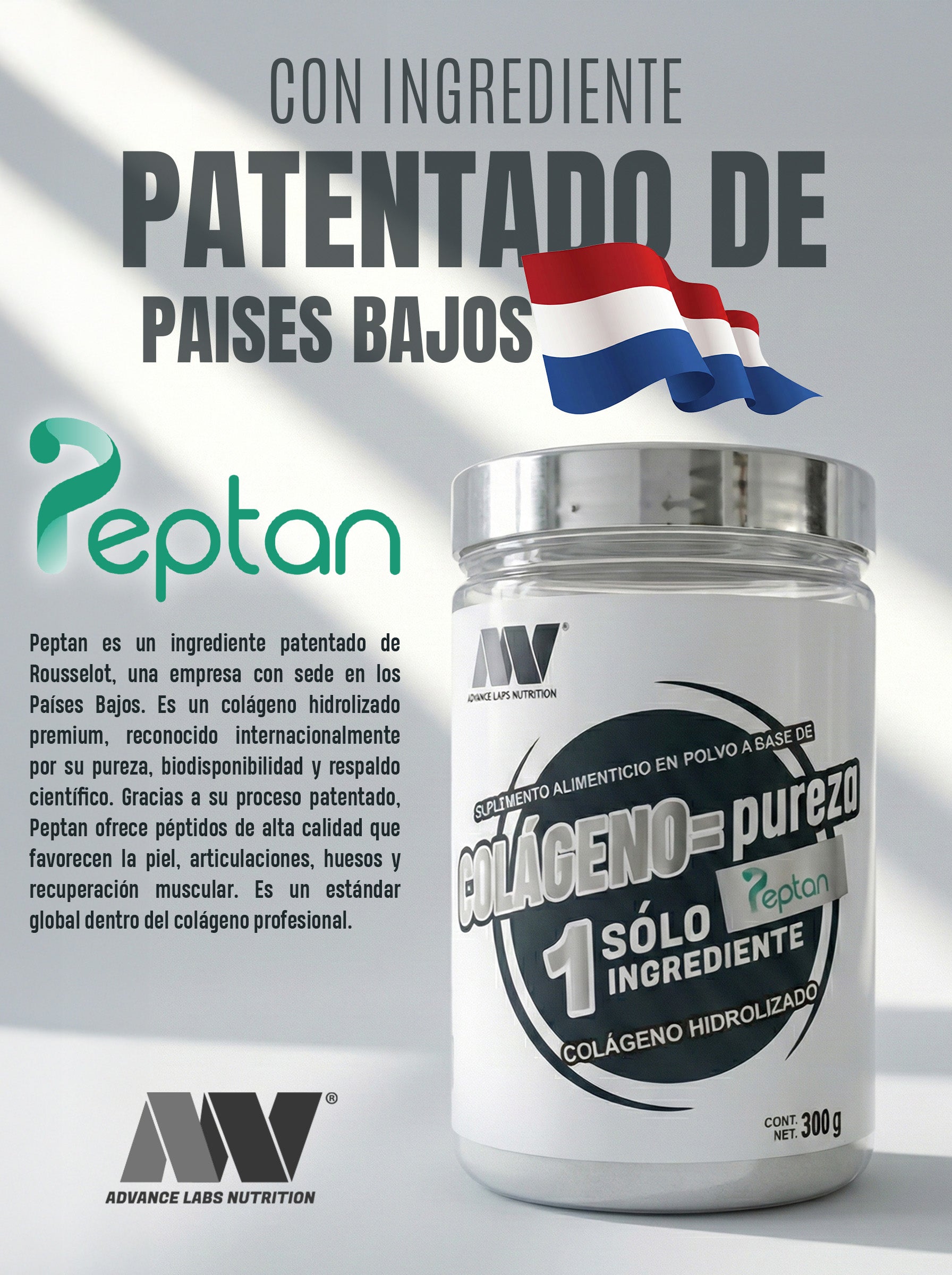 Descubre la calidad y pureza del Colágeno Hidrolizado Peptan® de Advance Labs Nutrition, elaborado con un solo ingrediente y sin aditivos. Ideal para complementar tu alimentación diaria de forma sencilla y versátil.